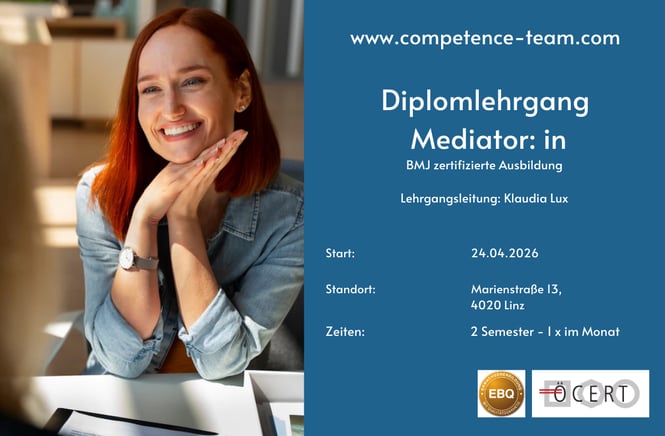 Mediation ist eine anerkannte Methode der außergerichtlichen Regelung/Streitschlichtung von Streitigkeiten und Konflikten der verschiedenen Art, zwischen zwei oder mehreren Personen. Die Konfliktparteien verhandeln mithilfe einer neutralen und unparteiischen dritten Person, der/die BMJ zert. Mediator*in & Konfliktmanager*in, über die Konfliktsituation. Unsere erfahrenen Lehrenden vermitteln Mediation mit Herz und Haltung, und sind selbst als zertifizierte Mediator*innen in eigener Praxis tätig. Profitieren Sie von praxisorientierten Übungen, echten Fallbeispielen und direkter Expertise aus dem Berufsalltag.