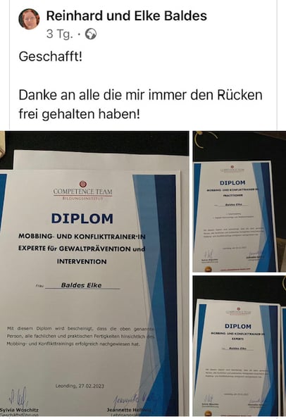 Im Competence Team weiß man worüber man spricht. Frau und Herr Woschitz betreiben nicht nur mit hohem Engagement das Bildungsinstitut, Sie sind auch dementsprechend ausgebildet. Beide sind Dipl. Lebens- und Sozialberater: in, Psychologische Berater: in, Supervisor: in und Mediator: in und haben auch ein Studium der Betriebswirtschaft absolviert. Warum ich genau dieses Institut immer wählen würde? Es ist genauso wie beschrieben. Hier weiß die Leitung und die Trainer*innen genau, worüber sie sprechen. Der Unterricht trifft zu 100% den Zeitgeist. Die hohe Praxisorientierung war für mich spitze, da ich gerne durch aktives Tun lerne. Als Mutter von 2 kleinen Kinder ( 4 und 7 Jahre) hat mir besonders die Buchung des Rundumpakets geholfen. So konnte ich Familie, Beruf und Ausbildung gut erledigen. Ein klasse Institut mit toller Betreuung. 100% Weiterempfehlung von mir! ;-)