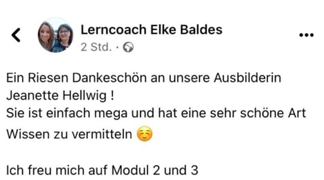 Was für eine Wertschätzung, wenn eine ausgebildeter Lerncoach wie "Frau Baldes", unsere Dozentin "Jeannette Hellwig" lobt!